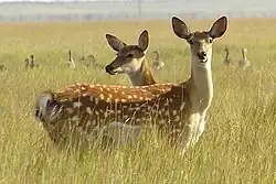 Пятнистый олень, бобр, выхухоль, ондатра и другие виды были завезены в Челябинскую область в советское время[6]. Первые 27 пятнистых оленей были завезены в Ильменский заповедник в 1938 году взамен давно уничтоженных на Урале благородных оленей[7].