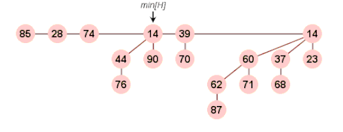 - Корни всех деревьев в связаны при помощи указателей и в циклический двусвязный список корней (англ. root list).