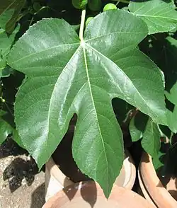 Листья фиги (инжир, смoква) по форме лопастые, разделены на 3—7 долей, до 10—25 см в длину, до 20 см в ширину, с волнистым и местами зубчатым краем, очередные. Черешок до 7 см.