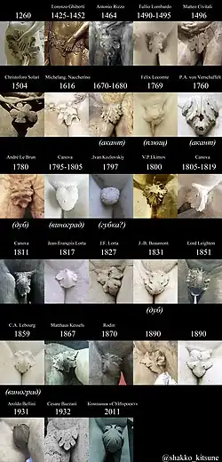 Следы: с 19 века идет обратная тенденция — статуи лишают приделанных фиговых листов, с целью восстановить историческую правду. Однако на них бывают видны цветные следы от металлических креплений или дыры от штифтов[8].