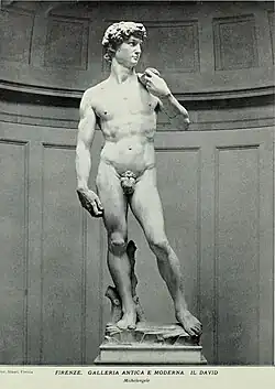 Мраморный «Давид» Микеланджело — наг, что шокировало флорентийцев. Вскоре после открытия статуи её наготу прикрыли гирляндой из 28 бронзовых фиговых листьев[4], которая провисела по меньшей мере до середины 16 века.[5] В дальнейшем он был прикрыт лепным листком.