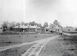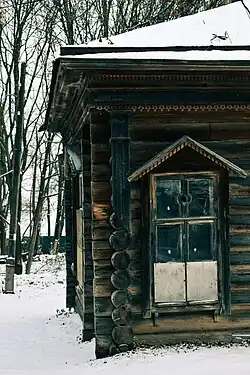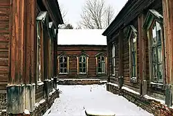 Одноэтажное здание — четырехстенка «старого зарбарака» — выполнено в дереве, бревна соединены «в охряп», построена в 1895 году. Крыша вальмовая, ступенчатый карниз декорирован двумя рядами резных деревянных подзоров с пропильными узорами. По периметру здания расположены прямоугольные колодчатые окна, обрамленные наличниками с щипцовыми завершениями. Особенностью конструкции окон являются круглые форточки небольшого размера, расположенные в верхней части окна.