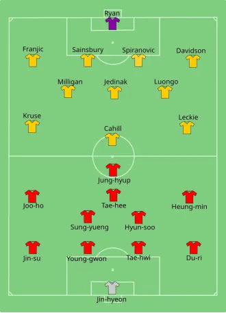 Состав сборной Австралии не претерпел изменений по сравнению с полуфиналом с ОАЭ, как и их тактическая формация 4-3-3. Иван Франьич, несмотря на незалеченное повреждение бедра, вышел играть с первых минут. Команда Анге Постекоглу сделала ставку на прессинг со стороны четырёх игроков группы атаки — занявших позиции нападающих Тима Кэхилла, Робби Круза и Мэттью Леки и игравшего в полузащите Марка Миллигана[22].
