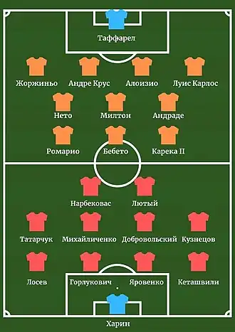 После бурного начала, когда команды обменялись рядом опасных моментов, игра вступила ближе к середине первого тайма в позиционную фазу борьбы за инициативу. И здесь бразильцам улыбнулась удача: на 30' после подачи углового Нето с правого фланга Харин ошибся на выходе и, столкнувшись с Карекой и опекавшим его Кеташвили, не добрался до мяча, который прошел на дальнюю штангу, куда вовремя рванулся Ромарио (которого «потерял» Горлукович) и замкнул передачу — 0:1.