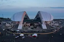 Первоначально планировалось, что облик стадиона будет напоминать пасхальное яйцо Фаберже[5]. В итоге был утверждён проект, использующий образы одновременно ракушки и снежной вершины[6]. У стадиона четыре трибуны: две боковые, крытые полупрозрачным поликарбонатом, и две торцевые, открытые.