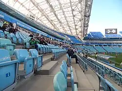 Навес над западными и восточными трибунами закрывается светопрозрачным материалом — этилен-тетра-фтор-этиленом. Он обладает повышенной прочностью и коррозионной стойкостью.