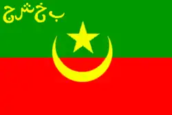 «Государственный флаг Б. Н. С. Р. состоит из двух параллелей сшитых полотнищ: верхнего — зелёного цвета и нижнего — красного, с изображением посреди их золотого серпа полумесяца, внутри которого находится золотая пятиконечная звезда. На верхнем зелёном полотнище в левом его углу у древка помещены буквы Б.Н.С.Р.»[35].