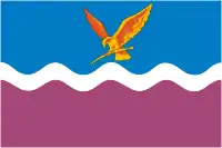 «Прямоугольное полотнище с отношением высоты к длине 2:3, состоящее из двух горизонтальных полос голубого цвета (вверху) и малинового цвета (внизу) шириной в 1/3 ширины полотнища, разделённых горизонтальной белой волнистой полосой в 1/10 высоты полотнища. В центре голубой полосы — фигура из герба Тимашёвского района — жёлтый летящий к древку орёл с жёлтой казачьей шашкой в лапах».