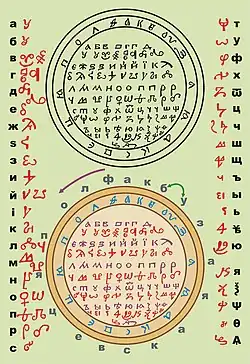 В рукописи Московской Публичной библиотеки О. XVI. 2 (Толст. III, 27) л. 94 об. находится ключ к «флопяцевской азбуке»[1] (см. рис.).