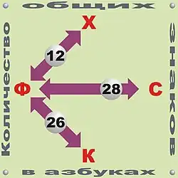 - десяти греческих букв — «дельта» для буквы Е, «омега» для букв И, У и О, «ипсилон» для букв А, Б и И, «ро» для буквы Р, «сигма» для буквы С, «фи» для буквы Ф, «хи» для русской буквы «кси» и «пси» для русской буквы «пси».
