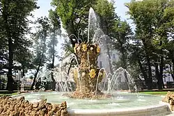 | Фонтан на Царицыной площадке (Царицын фонтан) | Главная аллея, первая площадка | 59°56′48″ с. ш. 30°20′03″ в. д. | 1706-1708 гг., 2010-2011 гг. (воссоздание) | ![]() | действует | |