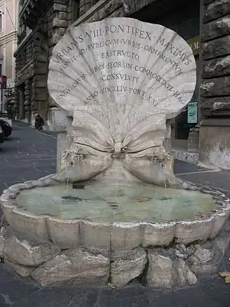 Надпись на корпусе говорит: «VRBANVS VIII PONTIFEX MAXIMVS FONTI AD PVBLICVM VRBIS ORNAMENTVM EXSTRVCTO SINGVLORVM VSIBVS SEORSIM COMMODITATE HAC CONSVLVIT ANNO MDCXLIV PONT XXI»[уточнить].