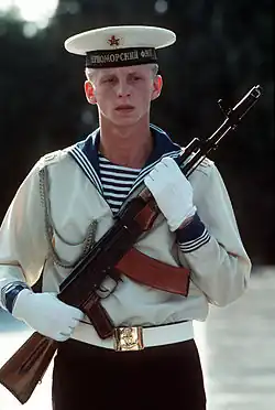 Состоит из переда, спинки, воротника и рукавов. Перед и спинка цельные. В верхней части переда, посредине, разрез. Рукава втачные с манжетами, застегивающимися на одну пластмассовую пуговицу. Внизу боковых швов разрезы (шлицы). Широкий отложной воротник и манжеты — из бязи тёмно-синего цвета с тремя белыми полосами: в воротнике — по отлёту и боковым сторонам, в манжетах — по верхнему краю и боковым сторонам. Погончики белые нашивные соответственно воинскому званию.