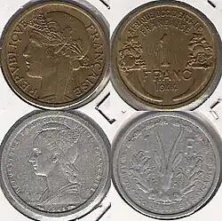 - С легендой «Французский Союз», «Французская Западная Африка» — 1, 2 франка,