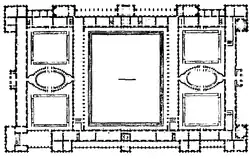 Планировка богатого городского жилища продолжала традиции средневековья: внутренний двор обрамляли жилой корпус, располагавшийся в глубине двора и службы; по фасаду обычно шло низкое крыло с плоской крышей, не закрывавшее вид на основной корпус. Такой план имел первоначальный комплекс дворца Карнавале[76].