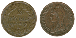 Чеканка монет в 2 десима также была начата в период Первой республики, в 1795 году. Рисунок монеты был выполнен генеральным гравёром Огюстеном Дюпре. Год чеканки обозначался годом республиканского календаря. Монеты в 2 десима чеканились только в 4—5 (1795—1796) годах. В 1796—1800 годах в связи с изменением монетной стопы была произведена перечеканка и надчеканка этих монет со снижением номинала до 1 десима[4].