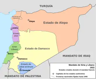Сирия делилась на 6 частей: Государство Дамаск, Государство Алеппо, Государство Алавитов, Великий Ливан, Государство Друзов и санджак (провинция) Александретта. Великий Ливан позже стал современным Ливаном. На 1 декабря 1924 года алавиты отделились от федерации, а Алеппо и Дамаск сформировали государство Сирийскую республику.