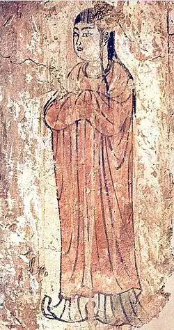 Женская фигура справа одета в банби и рукун, традиционные китайские наряды, которые состоят из короткой зелёной куртки с длинными рукавами, доходящей только до середины верхней части тела; длинной юбки, которая закрывает ноги; коричневого плаща или шарфа, слегка перекинутого через правую половину тела от плеча до половины бедра и от левого плеча до груди. Она носит зелёные туфли с поднятыми носками. Густые чёрные волосы сложены на макушке в сферическую структуру. Троих прихожан можно сравнить с фигурами уйгурских принцев и принцесс, которые держат цветы на наскальных рисунках в Безеклике.
