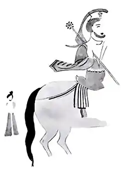 - ↑ According to Ken Parry, the figure riding on horseback; according to Meicun Lin and Szonja Buslig, what the figure mounted is a donkey.