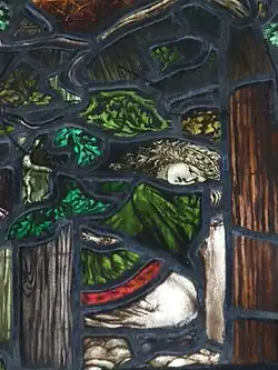 ![]() Фридесвида прячется от короля Алгара. Фрагмент витража, посвящённого Фридесвиде, в Глостерском соборе | |