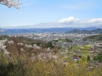 Сверху: Вид города Фукусима из парка Ханамияма Снизу: Центр города Фукусима | |||||