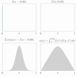 Интуитивная анимация, показывающая, как функции Грина, решающие дифференциальное уравнение с точечным источником, могут быть наложены друг на друга для решения его с произвольным источником.