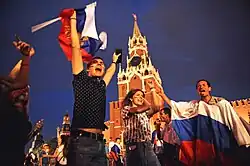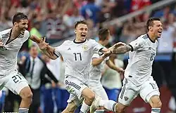 ![]() Сборная России празднует выход в четвертьфинал | |||||||