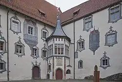 Около 1499 года дворовые фасады крыльев замка и надвратной башни были украшены необычайно богатыми декоративными узорами. Окна обрамлены великолепными сплетениями с навершиями. Из фасадов словно выступают многочисленные эркеры, украшенные гербами. Считается, что исполнительным мастером является художник Фиделис Эйхеле из Хехингена.