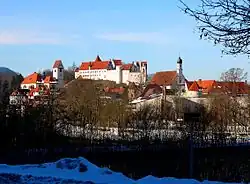 Замок расположен на восточном предгорье хребта, на другом конце которого находится крепость Фалькенштайн (недалеко от Пфронтена). Со времён Средневековья крепость стала составной частью городских укреплений. То есть превратилась в цитадель Фюссена. Замок вместе с расположенным чуть ниже по склону монастырём Святого Манга создали яркий архитектурный ансамбль над старинной частью города Фюссен.