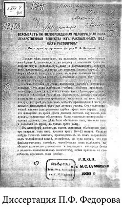 4 марта 1885 года П. Ф. Фёдоров защитил докторскую диссертацию на тему «Всасывает ли неповрежденная человеческая кожа лекарственные вещества из распыленных водных растворов». Оппонентами П. Ф. Фёдорова были профессора ИВМА В. А. Манассеин, П. П. Сущинский и А. Г. Полотебнов.