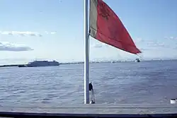 Внизу — Амур, слева направо — протока Пемзенская, вверху слева — устье реки Тунгуски. - Хабаровский мост в июле 2013 года. Амур течёт слева направо, выше моста в него впадает Пемзенская протока. Также видны поезда на станции Амур.