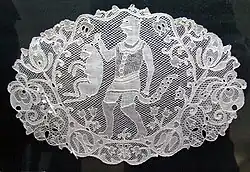 Техника шитья кружева распространилась из Италии в XVI веке . Для его изготовления использовалась очень тонкая отбеленная льняная пряжа. По контурам рисунка, начерченного на бумаге, натягивается направляющая нить.