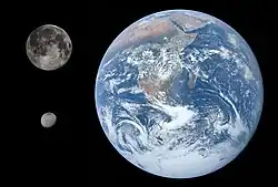 Сравнение размеров Земли, Луны и Харона (слева снизу)