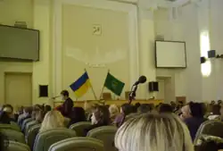 - ↑ Решение городского совета Харькова от 6 марта 2006 года: «Признать русский язык в г. Харькове региональным языком в определении Европейской хартии региональных языков или языков меньшинств. Установить, что Харьковский городской совет, его исполнительные органы в своей работе и в официальных документах, сообщениях, объявлениях используют наряду с украинским (государственный язык) русский язык (региональный язык) — языки работы, делопроизводства и документации (рабочие языки)».
