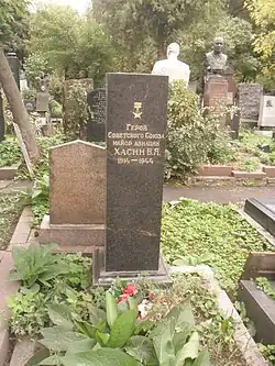 14 января 1944 года отважный лётчик-истребитель, командир эскадрильи 66-го гвардейского истребительного авиационного полка (4-я гвардейская истребительная авиационная дивизия) гвардии майор Хасин В. Я. трагически погиб в Москве.