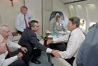 Кен Хачикян с президентом Рональдом Рейганом, первой леди Нэнси Рейган, пресс-секретарём Ларри Спиксом, начальником штаба Доном Риганом и помощником Деннисом Томасом на борту Air Force One, 1986 год