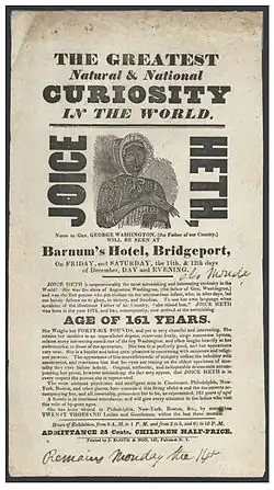 - ↑ Joice Heth Poster, 1835 Архивная копия от 6 января 2003 на Wayback Machine (англ.)