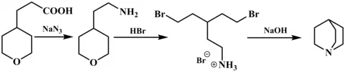 Группой В. Прелога был предложен синтез хинуклидина из 2-(4-тетрагидропиран)пропионовой кислоты. На первом этапе кислоту вводили в реакцию с азидом натрия с образованием 4-(2-аминоэтил)тетрагидропирана, который затем кипятили с бромоводородом в течение 7 часов, получив 1,5-дибром-3-(2-аминоэтил)пентан, на который действовали гидроксидом натрия, под действием которого происходила циклизация с образованием хинуклидина[3]: