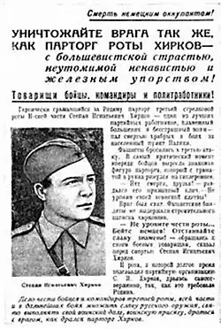 Товарищи бойцы, командиры и политработники! Героически сражавшийся за Родину парторг третьей роты Н-ской части С. И. Хирков — один из лучших партийных работников, пламенный большевик и бесстрашный воин — погиб в боях за населённый пункт Палики. Коммунист С. И. Хирков оправдал доверие народа, пославшего его защищать честь и свободу Родины, оправдал доверие партии большевиков, совершив в последнем бою поистине бессмертный подвиг. Каждый воин Красной Армии должен быть таким, как Хирков – храбрым, отважным, не знающим страха в борьбе. Вперёд, товарищи! Приближайте час победы!