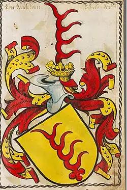 Герб с оленьими рогами, скорее всего, был перенят от семьи фон Хиршберг, являвшейся предками Иоганна. Судя по всему, название Хиршхорн также было придумано в память об этой семье.