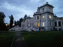 История усадьбы берет свое начало еще в XV веке, тогда ей владел сын купца Георгий Сафарлин по прозвищу Ховра (неопрятный, нечистоплотный)[29]. От этой клички и пошло название образованного здесь села Ховрино, а затем и столичного района. В XVI-XVII веках усадьба принадлежала потомкам Сафарлина из рода Третьяковых-Ховриных. Затем усадьба принадлежала представителям знаменитых дворянских родов — Шереметевым, Голицыным, Головиным, Оболенским. Парковый ансамбль построили на территории Ховрина в XVIII веке, но в 1812 году он был сожжен наполеоновскими войсками . При следующем владельце усадьбы, предпринимателе Евграфе Молчанове, был построен новый господский дом и Знаменская церковь, восстановлен утраченный парк, где также высадили новые деревья и кустарники, а также разбит дачный поселок, где Молчанов сдавал в аренду летние домики. При следующем владельце, купце Панове, господский дом снова сгорел — предположительно, его подожгли местные крестьяне из-за неприязни к Панову. В 1895 году усадьбу купила семья Грачевых. Под впечатлением от здания казино Монте-Карло в Монако, Митрофан Грачев отстроил на территории усадьбы дворец в похожем стиле — автором проекта стал знаменитый архитектор Лев Кекушев. Здесь побывало много представителей интеллигенции тех лет — Петр Чайковский, Алексей Толстой, Владимир Гиляровский, Кирилл Лемох, Валерий Брюсов[30]. После революции 1917 года здание усадьбы передали Петровской сельскохозяйственной академии (будущей Московской сельскохозяйственной академии имени К. А. Тимирязева), затем здесь размещались туберкулезный диспансер, госпиталь для тяжелораненых во время Великой Отечественной войны и Московская областная физиотерапевтическая больница, которая располагается в здании и по сей день под именем Клинический центр восстановительной медицины и реабилитации[31]. В советское время часть усадебного парка была вырублена, а протекающая здесь река Лихоборка была помещена в коллектор — сегодня о реке напоминает лишь подпитываемый ею маленький пруд в северной части парка.