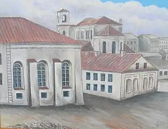 В 1896 году Московское археологическое общество обратилось к минскому губернатору Н. Н. Трубецкому с просьбой «приказать снять план с еврейской синагоги г. Минска, которая, как значится в делах общества, была обращена в синагогу только в 1796 году из православной церкви бывшего Петропавловского женского монастыря». План синагоги, расположенной на Школьной улице, которая вела с улицы Немигской на Соборную площадь, был вычерчен и отослан в Москву, где хранится в историческом архиве. Вопрос о прежней принадлежности здания остаётся невыясненным, потому что документы об этом до настоящего времени не найдены.