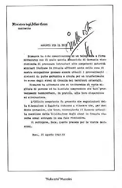 Весной 1942 года немцы начали депортацию европейских евреев в лагеря смерти в соответствии с программой окончательного решения еврейского вопроса. В связи с этим поверенный в делах немецкого посольства в Риме князь Отто Бисмарк 18 августа 1942 года обратился в Министерство иностранных дел Италии с просьбой к итальянскому правительству помочь выполнить соглашение между немецкими и хорватскими властями о депортации хорватских евреев, находящихся в итальянской зоне оккупации. Министерство иностранных дел представило просьбу Муссолини, и он дал своё согласие, написав на докладной записке по данному поводу «не возражаю» (итал. nulla osta). Планы массового уничтожения немцы не афишировали[29].