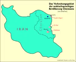 В период арабских завоеваний в Иран, включая Хорасан, Афганистан и Среднюю Азию, переселилось около 250 тыс. арабов. За исключением изолированных общин, все они были поглощены местным населением[1]. Большинство хорасанских арабов ведут оседлый образ жизни[2], практически не смешиваясь с местным населением[3]. В настоящее время около 5—10 тыс. носителей хорасанского диалекта проживают в нескольких селениях в Хорасанском регионе на востоке Ирана, вдоль границ с Афганистаном и Туркменией[4].