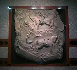 | Барельеф с изображением Фархада на горе Бисутун и Ширин, на памятнике Низами в Баку. Выполнено А. Хрюновым по эскизам Газанфара Халыкова, 1949 |