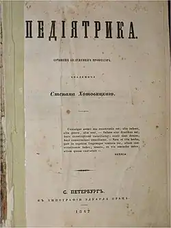 - Хотовицкий С. Ф. Педиятрика / Соч. засл. проф., акад. Степана Хотовицкого. — СПб.: тип. Э. Праца, 1847. — 858 с.