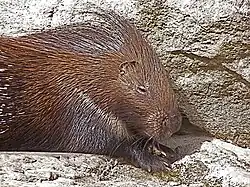Нижняя сторона тела покрыта темно-бурыми волосами. Морда дикобраза тупая и закруглённая, покрытая тёмной шерстью. На морде игл нет. Глаза круглые и маленькие. Уши маленькие и почти не заметны. Зубы, как у всех грызунов, сильные; особенно развиты резцы, покрытые оранжевой эмалью, которые хорошо видны снаружи даже когда зверь закрывает пасть.
