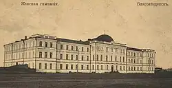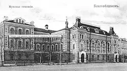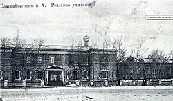Новое здание мужской гимназии было построено в 1912 году по проекту архитектора Э. И. Шеффера. В гимназии была устроена домовая церковь, внешне выделенная главкой; освящена в 1912 году, после революции закрыта, не сохранилась. В честь какого святого или праздника был освящён храм неизвестно. Ныне бывшая гимназия — один из корпусов Благовещенского государственного педагогического университета[13].