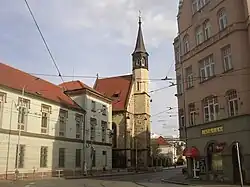 У фасада церкви стоит стройная башня, высокая 38 метров. Башня имеет в нижней части форму четырёхугольной призмы дважды окруженную карнизами, сначала на высоте под окнами, а потом у уровня коронного карниза нефа. Башня выше продолжается узким призмовым этажом со стрельчатым сводом. Эта часть башни имеет три этажа, разной высоты. Над вторым карнизом следует более узкая, восьмиугольная часть с двумя стрельчатыми окнами в этажах, разной высоты. Толщина кладки башни около 80 см[2]. Купольная крыша времен барокко была Грубером заменена на пирамидальную, которая до сих пор находится на башне. Эта башня в сравнении со всеми остальными имеет наибольший отклонение от вертикали, 63 см по направлению к улице На Слупи.