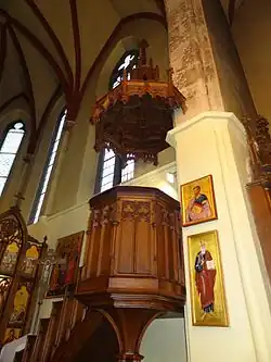 Хоры созданы в псевдо-готическом стиле, их окружает выразительный, полностью обновленный карниз. Из карниза выходят держатели сводовых ребер, а под ними расположены консоли современного типа. Держатели имеют чашевидные капители, которые покрыты резными виноградными и капустными листьями. На колоннах нефов есть ещё листья липы. Сохранились колонны посередине двух продольных стен и в западных углах.